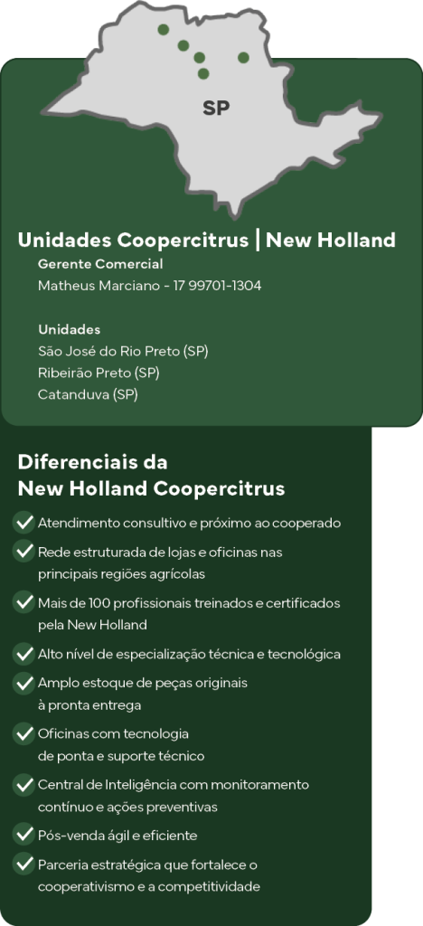 A cooperativa conta com lojas e oficinas estrategicamente distribuídas, além de equipes comerciais, técnicas e administrativas dedicadas, alinhadas às diretrizes da Coopercitrus e da própria New Holland. “Essa estrutura garante agilidade no atendimento, suporte técnico especializado e soluções completas ao produtor rural”, completa.