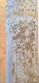 Com o uso de uma lupa de bolso (10x a 50x), é possível identificar as estruturas dos fungos na parte externa do colmo: